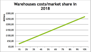 To calculate the cost of warehouses by market share, we took the results of the first section for each year like stated before (example: 8.366.100 Pounds of revenue for a market share of 1%) and we multiplied it (i.e. the revenue by market share for a specific year) by the following ratio in order to have coherence with BWB US:
