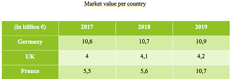 Our analysis gathered that the German market value was €9.7 billion in 2010, the French one was €5 billion in 2009 (Simon & de Prato, 2012) and the English one €3.9 billion in 2014 (The Publishers Association, 2014 : The UK Book Publishing Industry in Statistics 2014) Hence, the market value for the different targeted country are the following: