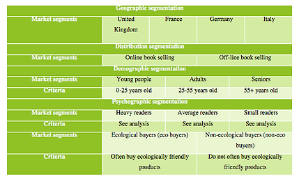 Entering the European market, we believe BetterWorldBooks should focus on specific market segments. The choice of the target market is largely based upon the analysis of the different segments detailed in the second part of our analysis. Besides, the particularities of the company, BetterWorldBooks, will also be taken into account in the definition of this target market.